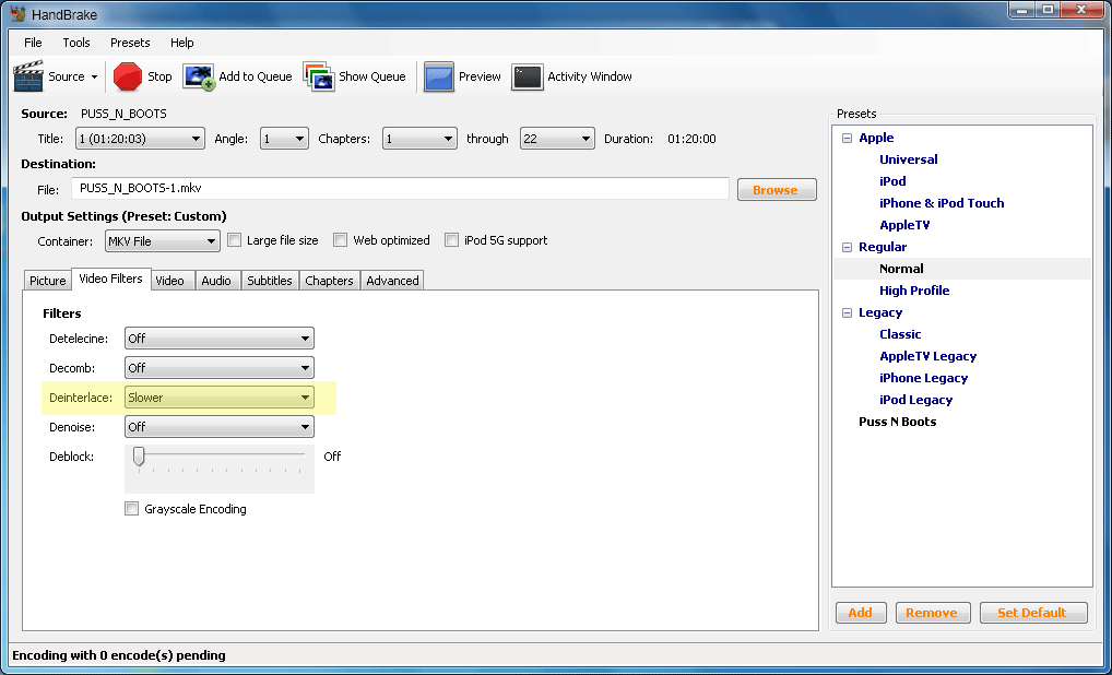 I then used Handbrake and chose the “Deinterlace” video filter to remove the interlacing: