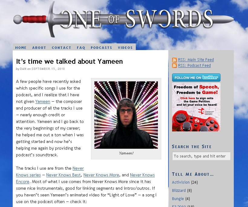 So QUICK! Hit the link and check out the One Of Swords website! Tons of behind-the-scenes news and features on some of video gaming’s biggest titles. And Dan is crazy knowledgeable and hilarious, so download a podcast or two as well!