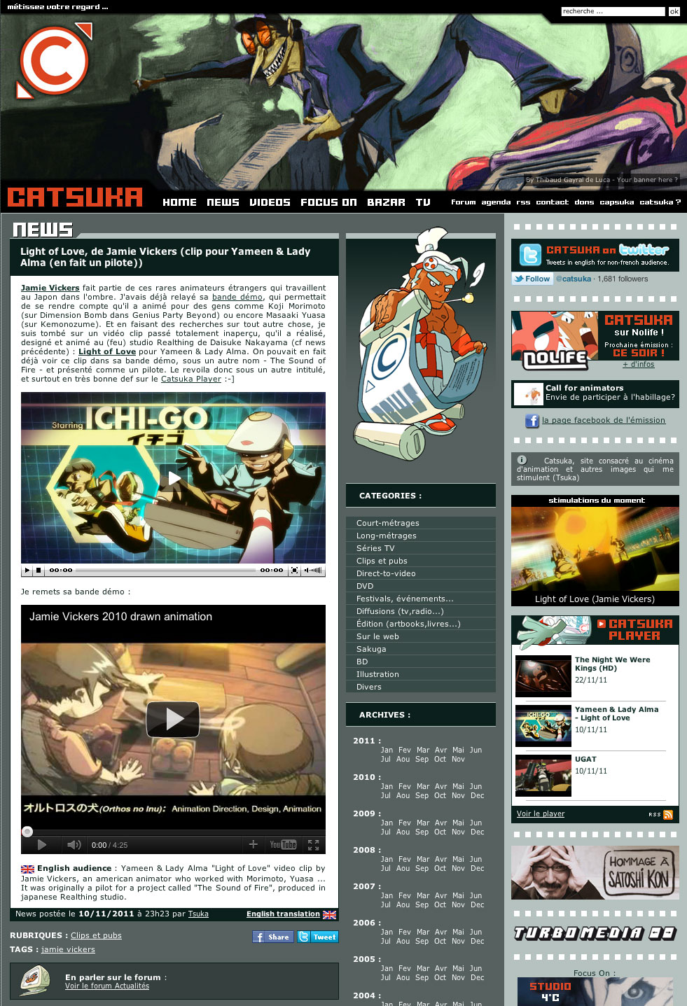 French anime website, Catsuka recently featured the Light of Love anime video and its director, Jamie Vickers on its pages, giving a bit more insight into the origins of the video (which was in fact a pilot for a television show). From Google Translate: